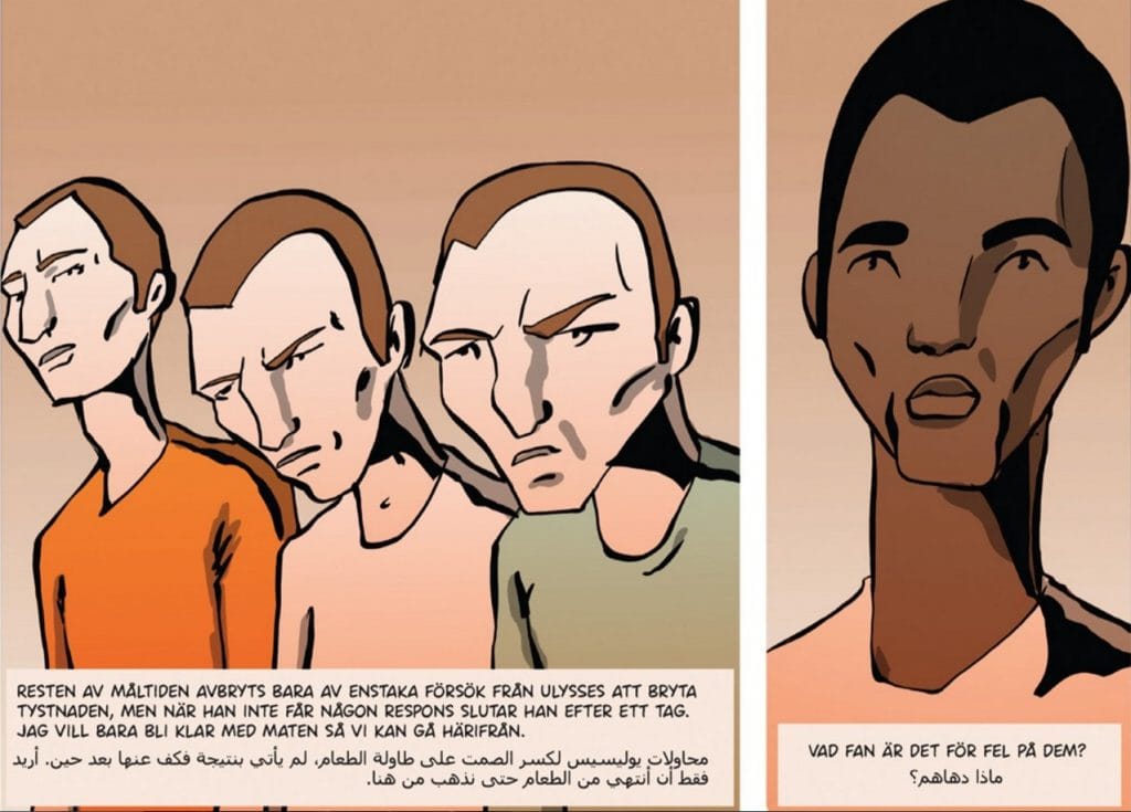 Selve tegneserien er altså finurlig lagt opp. Men det svikter litt i utførelsen; strukturen er mer interessant enn fortellingen. Tegningene er ved Shko Askari, en Malmø-bosatt tegner av innvandrerbakgrunn. Han er også ansvarlig for den arabiske tekstingen, så det virker sannsynlig at han føler sterkt personlig for prosjektet. Men selv om figurene hans er stiliserte, i kontrast til de fotografisk realistiske og diffuse bakgrunnene, minner tegningene hans litt vel mye om storyboarding. De er stive og blir sjelden noe mer enn et passivt akkompagnement til teksten.