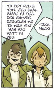 I bind 2, TOM SAWYER, er ingen fargelegger kreditert. Vedkommende har gjort en slapp jobb, men så hadde han ikke like mye å jobbe med, heller. Tegningene til Rad Sechrist er rutinerte og sikre, men Sechrist har også en enklere og flatere strek enn Caldwell. Figurene hans likner ganske mye på hverandre, og fascinasjonen hans for prikkeøyne og knappeneser gjør ikke det inntrykket bedre. Muff Potter minner meg om Snorre fra Karine Haalands serier, av en eller annen grunn. Et par sekvenser prøver Sechrist å gjøre noe visuelt mer interessant, men for det meste er dette veldig traust. Og dialogbasert.
