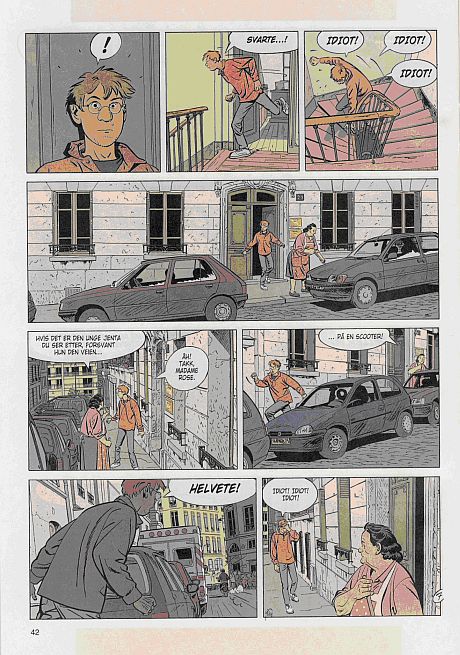Rute fire dekker hele sidens bredde og vi ser Jerome komme ut av inngangsdøra (samme dør som i første rute side en). Gata heller nedover til venstre og Jerome titter litt til venstre, men leseretningen til høyre gjør at vi er litt i tvil om hvilken vei vi skal se. Hverken leseren eller Jerome vet hvilken vei jenta forsvant. I rute fem ser vi nedover i gata samtidig som Madame Rose forklarer at jenta forsvant nedover der. I rute seks springer Jerome nedover til venstre, og gata heller også nedover til venstre. Dette gjør det igjen lettere for leseren å flytte blikket til nederst på siden. Men nederste venstre rute krever at vi forstår at Jerome er kommet ned til veikrysset, og ser nedover i gata til venstre. Ellers gir det ingen mening at nå står på venstre side av gata og ser jenta forsvinne på scooteren.