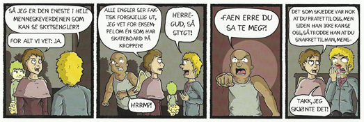 De viktigste bidragsyterne er for øvrig utgiver Aleksander Dokkeberg (åtte sider) og Trond J. Stavås med en ti siders historie om en brødrister som blir omprogrammert til kamprobot (den er bedre enn den høres ut til). Dokkeberg er en av serie-Norges mest produktive tegnerspirer i senere tid; i tillegg til å være utgiver, redaktør og tegner av Nye Streker har han også gitt ut to blader med bare eget materiale – Slappis 1 og 2. Jeg vil nødig rakke ned på så produktive og initiativrike tegnere som Dokkeberg og Stavås men de har mye å lære om anatomi. Dokkeberg sliter også litt med poengene (her er Stavås noe bedre), skjønt han er muligens i ferd med å finne formen med sin nye serie Gnarl, om opplæring av skytsengler. Overraskende nok greier han å begrense seg til bare én Märtha Louise-vits om dette temaet.