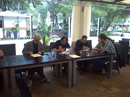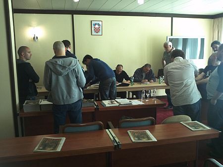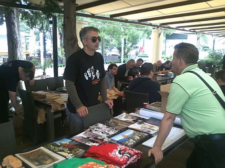 Signeringsbord på hotellet pga stor vind på stranda. Vi skimter norgesvennen Bane Kerac sittende til høyre.
