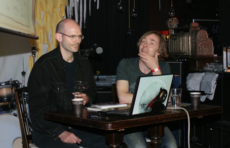 Henry Bronken (t.v.) og Erik Falk (Jippi Forlag) samtalte om Bronkens tegneserier og hans nyeste bok “Made in Karasjok” som sannsynligvis blir klar til Oslo Comix Expo.