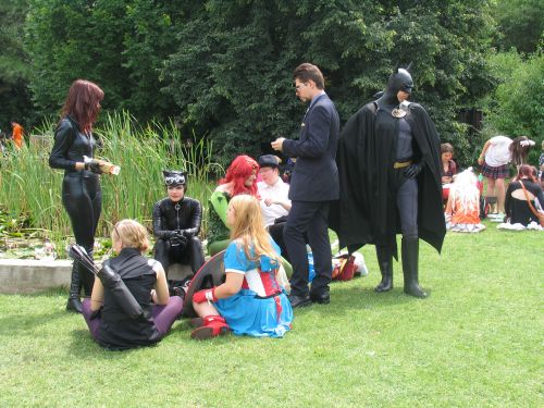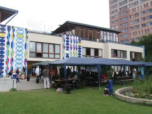 Kulturní Centrum Zahrada er det lokale kulturhuset i bydelen. Her finnes det en stor kinosal, små auditorier, en kafé og en rekke møterom. Utenfor er det satt opp telt, og det serveres grillpølser og annen mat til de fremmøtte. Det er trangt i teltet, og etter hvert skal jeg forstå hvorfor. Det er såpass varmt inne i enkelte av rommene i kulturhuset at mange foretrekker å tilbringe mest mulig tid utendørs. Dermed blir det fornøyelig å se seg rundt i hagen ved siden av. Der sitter Catwoman og slår av en prat med en kvinnelig Captain America mens Batman overvåker det hele. Artig!