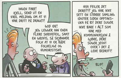 Men de som det er blitt plass til er i alle fall morsomme nok. Den første historien (og rett skal være rett, stripene er sammenhengende nok til å kalles en historie) dreier seg rundt et møte med en konsulent på sosiale medier, som langsomt drives til vanvidd av Baches ærlige uvitenhet og Kjells mer beregnende og opportunistiske uvitenhet. Den andre historien handler om Nicos besettelse for Apple-teknologi og hvordan Kjell finner nye måter å mobbe ham for dette. Et tilbakevendende tema, men fortsatt med tilstrekkelige variasjoner.