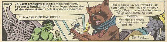 Historien er skrevet av Bill Mantlo og tegnet av Sal Buscema, og man aner at Mantlo hadde sterk personlig interesse av å få den ut. Den bryter nemlig med kontinuiteten, og for Hulk virker episoden som en helt unødvendig omvei. Men saken er at Mantlo, sammen med Keith Giffen, skapte Rocket Racoon i 1976 (Marvel Preview # 7), og i den aktuelle Hulk-historien leker Mantlo seg med det lille universet som han har skapt for vaskebjørnen. Resultatet er bisart, og igjen, det ville være å gå alt for langt i detalj å skulle forklare handlingen (jeg kan nevne moderklovner og stumfilmpoliti, og da har jeg bare såvidt begynt). Men i korthet handler det om jakten på Keystone-kvadratens store kloke bok, som heter Gideons Bibel. Enda en Beatles-referanse.