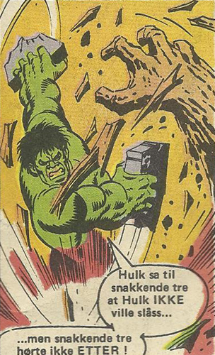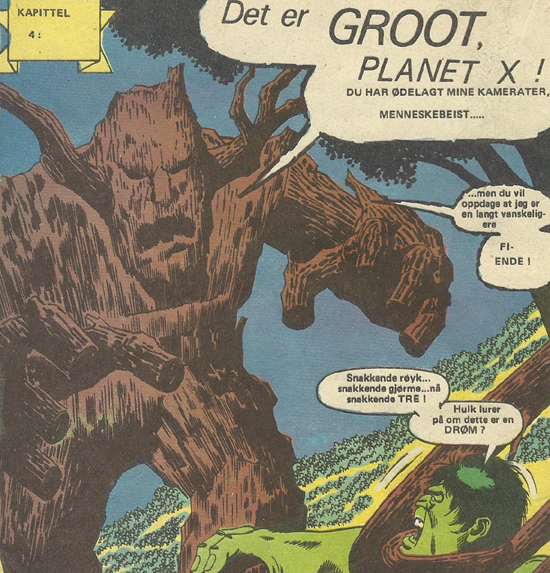 Men som sagt, ved en kuriøs tilfeldighet møter Hulk Rockets kompis Groot kort tid etter. Kort tid i norsk kontinuitet, altså. I amerikansk kontinuitet er denne historien flere år eldre (Incredible Hulk Annual # 5 fra 1976). Og skal vi være helt ærlige så er det ikke den, «ekte» Groot han møter. Mer om det om et øyeblikk. Vi er kommet til juli, og Atlantic lokker med et «STORT samlenummer!» (i stedet for sommernummer). Historien «Angrep fra alle kanter» ble skrevet av en ung Chris Claremont, og er tilsynelatende uhyre enkel – Hulk møter en serie med bisarre monstre og slår dem alle etter tur mens han klager over at han ikke får være i fred. Men bakgrunnen for historien er litt mer spesiell: En ukjent fiende har klonet fem utenomjordiske slåsskjemper, og vil teste dem ved å sende dem ut for å drepe Hulk. Felles for disse skapningene er at de alle sammen dukket opp i Jack Kirbys monsterblader tidlig på 60-tallet. Selv i USA var det nok få som husket disse i 1976. Men med denne historien blir altså Kirbys gamle pulp-monstre en del av Marvel-kanonen.