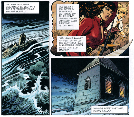 Lyspunktet er at “En piratdronnings død” ikke er den verste av Bishops senere historier. Jeg kan føle at forfatteren har villet gi heltinnen sin en skikkelig finale, og det siste kapittelet trekker linjer til mange tidligere historier, især den første fra nr. 26/2001, der en aldrende Kate inngikk en pakt med pirater for at de skulle spare nonneklosteret og medsøstrene hennes. I “En piratdronnings død” får vi vite etterspillet på denne episoden, for det handler om Kates skyldfølelse over enda en gang å ha syndet mot Gud, og en søken etter tilgivelse som fører til en aller siste kamp. Men selv om vi får både action og drama, har ikke manuset helt de gamle historienes driv og dramatikk, og César Spadaris tegninger er heller ikke fullt så flotte som for ti år siden. Jeg føler nok egentlig at historien om Kate var ferdig da hun gikk i kloster, og at det å spinne videre på sagaen over så mange historier som Bishop etter hvert gjorde (se side 2 i bladet for en full oversikt), var å koke suppe på suksessen. Salas oppsummering i siste rute blir ellers for moraliserende for min smak.