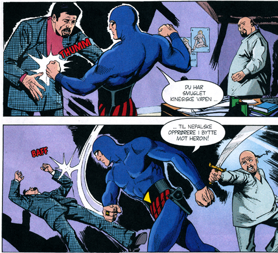 Uansett kan jeg vel starte med å anmelde “Snødemonens tempel” når den nå insisterer på å være først i heftet. Den tilsynelatende hensynsløse, skotske milliardæren Scott McDougall iscenesetter en ekspedisjon til Tibet under dekke av arkeologisk forskning, men egentlig grunnet et privat mål som han ikke skyr noen midler for å nå. Og det er en ekstra tvist – McDougall er beskyttet av Fantomets gode merke, gitt til ham av det 21. Fantomets far. Nr. 21 er nysgjerrig på hvordan dette kan ha seg og sniker seg med som værbitt turguide. (Ukjent jungelord: Fantomet er mann for mange hatter.) Ideen har potensiale, men Jens Hansegårds manus blir dessverre altfor kalkulert og slapt, med overbrukte narrative grep og flate personskildringer. Spesielt gjelder dette figuren som viser seg å være antagonisten, som mot slutten beskrives som “bunnløst grådig og ond”. Og selvsagt får vi for ørten tusende gang sekvensen hvor Fantomet, godt skjult av mørket, slår ut en gruppe fiender en etter en, mens de gjenværende gradvis begynner å lure på om de angripes av en demon (eller kanskje en ånd?!…)