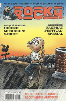 Temaet er festival, selv om det som sagt ikke forekommer noen slik i Rockys gotlandske saga. Ikke desto mindre har Martin Kellerman mange festivalopplevelser på merittlista, og i spalten Månedens Soundtrack får vi både historier, tegninger og spilleliste fra disse. I avdelingen for klassisk Rocky har bladet videre sju sider med festival-og musikkrelaterte striper. Sammenlagt får Rocky faktisk flere sider til rådighet enn vanlig i sitt eget blad. Månedens gjest er Flu Hartberg med Fagprat, som bidrar med seks sider inne samme tema. Det er et godt valg, for kultur er et av Flu Hartbergs sterkeste felt som satiriker og vitsetegner. Ikke det fyldigste og mest gjennomførte nummeret av Rocky, men det duger som lett sommerlektyre i pausene på en seinsommerfestival.