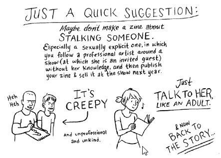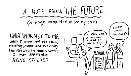 Arild Wærness (som er navngitt og avbildet flere ganger i boka) og andre som var involvert i Lucy Knisleys velvære i Bergen kan altså beroliget slå fast at hun hadde det hyggelig. Historien har likevel en litt flau ettersmak. Som kjent lagde Fredrik Rysjedal og Eirik Andreas Vik også en tegneserie om Raptusfestivalen 2011 (en som ikke var ment å være på langt nær så autentisk, må det legges til) “When We Met Lucy Knisley”. Kinsely fikk i ettertid se denne serien, og tolket den slik at disse karene faktisk hadde forfulgt henne, noe som visstnok har skjedd henne på tegneseriefestivaler før. Slik skildrer hun det her: