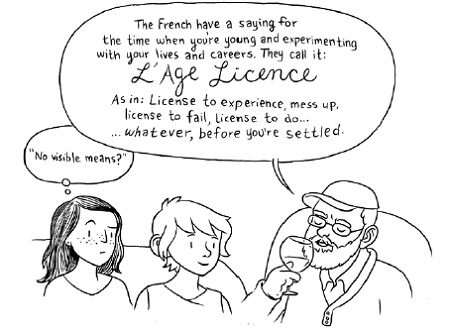 Henrik følger henne til Berlin, og de to møtes igjen i Paris, men – spoiler alert! – han blir aldri noe mer enn en sommerflørt. Om høsten. Paris har Lucy allerede omtalt i «French Milk», så i «Age of License» er det Berlin og de små og mellomstore franske byene som får mest plass i bokas andre del. Lucy virker vanligvis ganske sosialt utadvendt, men til glede (eller skadefryd?) for fansen hennes «nerder hun ut» når hun får sjansen til å stikke innom tegneseriemuseet i Angoulême. Ellers handler det mye om vin, mat, arkitektur og gode venners lag.
