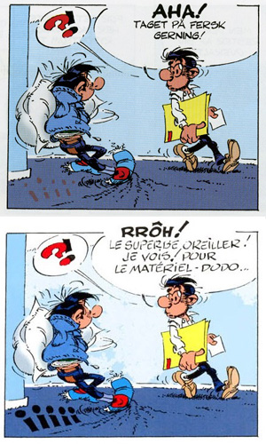 Det begynner muligens å bli en klisjé i anmeldelsene mine at siste del handler om trykkvalitet eller øvrig teknisk presentasjon, men jeg ser meg nødt til å ta det med her også. Nå skal jeg ikke si hundre prosent sikkert at det følgende problemet gjelder alle eksemplarer av albumet, men jeg tipper det: Noen mystiske, brune flekker dukker opp på flere av sidene, stort sett enten i snakkebobler eller i deler av tegningene hvor det logisk sett burde vært et lydord. Jeg vet ærlig talt ikke hva flekkene skyldes, men de ser ikke særlig bra ut. Det pikslete utseendet tilsier at de er dataskapte, og jeg mistenker at de har direkte sammenheng med den danske oversettelsen og maskintekstingen. Her er en dansk rute med flekker (istedenfor lydordet) sammenlignet med den franske originalversjonen:
