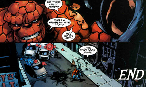 Men kanskje den aller største «kjendisen» blant jødiske superhelter er Ben Grimm, alias Tingen i de Fantastiske Fire, som fikk sin etnisitet nesten 40 år etter at han først dukket opp! I en historie fra 2002, som Kaplan drøfter grundig i boka, blir Ben for første gang identifisert som jødisk når han møter Mr. Sheckerberg, en kjenning fra sin gamle menighet i Bronx. Ben forteller at han tidligere har vært redd for å snakke høyt om sin etniske bakgrunn fordi han er redd det spesielle utseendet hans skulle bli brukt i antisemittisk propaganda.