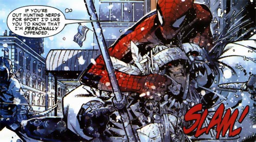 - Og jeg tror det er en av grunnene til at han overlever som en populær figur, istemmer Kaplan. – Barna elsker det, og det er også grunnen til at voksne elsker han så mye. Han tar ikke seg selv for høytidelig, det gjør ham mer menneskelig. Ikke at jøder har monopol på humor, men den typen humor som Spider-Man benytter seg av er tradisjonelle Borscht Belt –replikker som ikke ville vært malplassert i et Don Rickles-komedienummer på 50/60-tallet. Jeg synes det er interessant at forfatterne alltid gir Spider-Man slike replikker. Og det begynte med Stan Lee, som også er jødisk. Jeg har intervjuet Stan Lee, men ikke snakket med han om nettopp dette, for det er noe som slo meg mer nylig. Hvis jeg fikk en sjanse til å intervjue ham igjen ville jeg nok spørre ham om det. Vi skriver det vi kjenner. Lee vokste nok opp med mye Borscht Belt-humor og jødisk humor generelt.