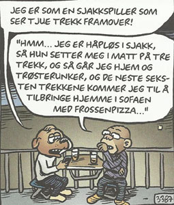 Månedens gjest er Nina Hemmingson, og forbindelsen hennes til månedens tema er noe tynn: intervjuer Lasse Espe kommenterer at figurene hennes «tenker flere trekk framover og gir uttrykk for det». Men la gå; Hemmingson, som jeg sist så i hennes eneste norske bok «Jeg er kjæresten din nå» (Schibsted 2008) er et velkomment gjensyn. Kjærlighet, sex og samliv er hennes felt, og disse temaene behandler hun gjennom dialoger som konsekvent er glitrende formulerte i all sin voldsomme kynisme. For det meste er vitsene hennes strengt verbale, men de stiliserte, minimalistiske tegningene formilder en dyp uro som står i stil med dialogen