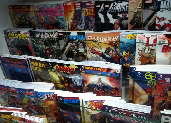 Bildet over er tatt på jernbanestasjonen i Erlangen samme helg som årets tegneseriefestival i byen. Utvalget av superhelttegneserier er stort i Tyskland, og som man kan se er det også en del mindre kjente tegneserier som utgis.