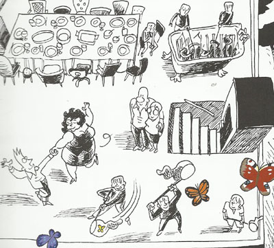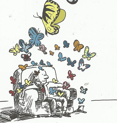 Tidlig i boka lar han en flokk med sommerfugler bære ham av sted, ut av vinduet og ut i horisonten (jamfør forsida), Forfatterne, som bivåner det hele, grunner på dette, og så setter han seg ned ved skrivemaskinen, hvorpå historien tar en ny vending. Kanskje kan dette tolkes som at Ærlig konkluderte med at scenen var for klisjeaktig, og nå ser behovet for å ta historien i en litt annen retning.