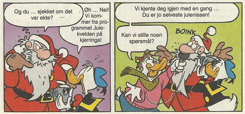 Det hender at disse julebøkene gir meg noen aha-opplevelser. I fjor fikk jeg to slike, i form av en interessant Mikke Mus-tidsreisehistorie som involverte både vikinger og Roald Amundsens ferd til Sydpolen, og en diskusjon om nyttårsfeiring mellom (av alle personer) Rikerud og Guffen. I år fant jeg ingen slike, men variasjonen er stor, både i valg av tema og figurer. Det var artig å se Jesper Skauen igjen etter så mange år, i en julefortelling som attpåtil har noen nesten psykedeliske trekk. Også en befriende outrert er åpningshistorien, der Donald må hjelpe Julenissen med å finne en spesiell sangerinne for å få ham i julestemning. En reality-tv-satire med Donalds barndomsvenner er også en av årets mer inspirerte fortellinger. Julehistorier fungerer best når den kombinerer jule-og vintermotiv med de litt mer sære karakterene og plottene. De typiske «jage skurkene»-historiene er kjedelig fyllstoff, selv når de kommer med snø og nisser.