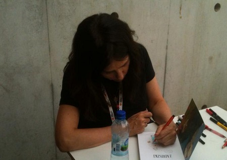 Rutu Modan tegner og signerer på tegneseriefestivalen i Warszawa i 2014. (Arkivfoto: Kristian Hellesund)
