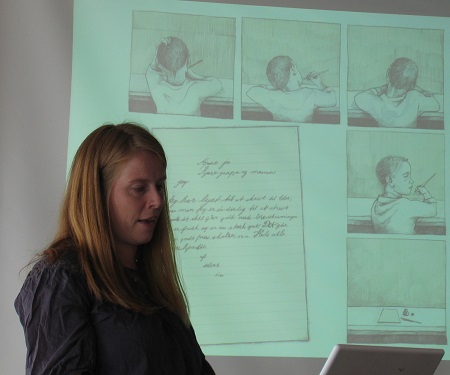 Lene Ask viser frem en side fra «Kjære Rikard» under tegneseriefestivalen Krusedull i Harstad i 2012. (Arkivfoto: Kristian Hellesund)