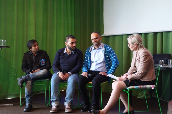 Men en var også innom det stadig mer aktuelle temaet ytringsfrihet. Arifur Rahman (første f.v., opprinnelig fra Bangladesh) og Fari Abou Hassan (tredje f.v., opprinnelig fra Palestina) har begge opplevd å bli fengslet og fysisk mishandlet for tegningene sine. Nå lever begge i eksil i Norge. Fari trenger fortsatt arabisk tolk for å gjøre seg forstått, mens Arifur greide seg med litt stotrende engelsk.