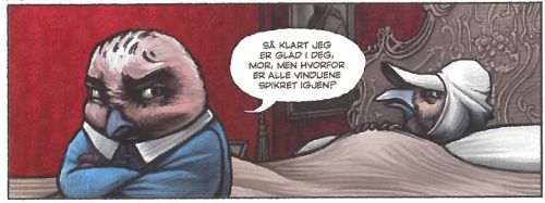 Jaybird har det ikke godt i huset, men verdenen utenfor er han opplært til å frykte mer. Samtidig skal han oppfylle morens ønsker for hennes del. Dermed blir tegneserieboken en oppvisning både i å skildre frykten for det ukjente og det å beskrive en omsorgsplikt overfor de nærmeste. Dette er noe Lauri og Jaakko Ahonen får godt frem. Anbefalt!