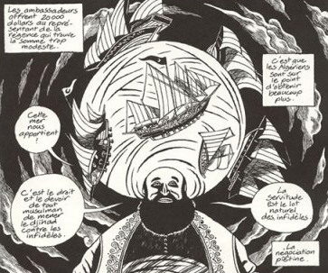 Med «De Beste Fiender», for eksempel, lå historien allerede der. Alt jeg kunne gjøre å gjenoppbygge den gjennom tegninger. Jean-Pierre Filiu ga meg fakta, men lot meg tegne det som jeg selv ville. Så jeg brukte mye symbolikk, for jeg ville ikke tegne en realistisk historie. Og jeg brukte gammelt symbolspråk for å representere krig og konflikt, fred og kommunikasjon mellom landene og alt det der.