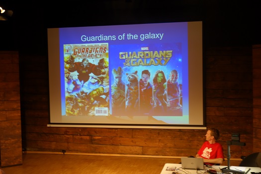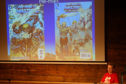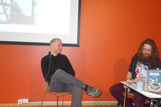 Selv om Jens K. Styve (under, f.v.) hadde fått formiddagsplassering til sin presentasjon, og måtte konkurrere med Arild Midthun, trakk han en nesten full sal da han dukket opp i Alver klokka 11.00, med Kim Holm som sekundant (eller intervjuer). Etter å ha konsentrert seg om å skrive romaner i flere år er han tilbake til tegneseriemediet med Jensk: Sesong 1. Boka, som blir lansert på Raptus, er en samling med spesialhefter som han har laget til sine «patrons» (mesener) på nettstedet www.patreon.com/jensk