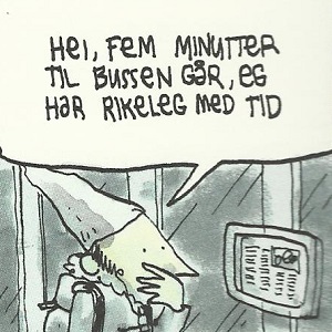 Så han omsette seriane tilbake til norsk, og samla dei i ei bok som i desse dagar er aktuell frå Jippi forlag. Opningshistoria “Sverigetur” sto først på trykk i Forresten 28, og seriane kjem ellers frå Patereon-publikasjonane, fortel han. Berre historia Home, som han laga til OCX sin 24H Challenge i 2014, er ikkje tidlegare utgjeve.