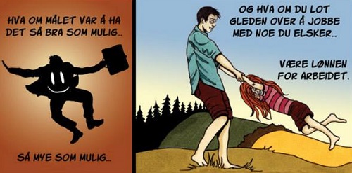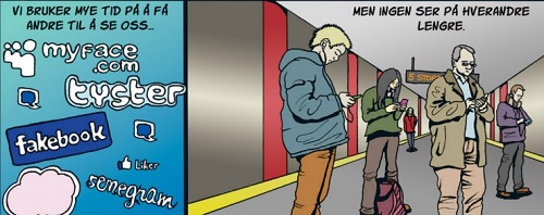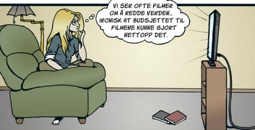 Nokre ord om formatet og den grafiske presentasjonen. Boka er i ekstra stort avlangt format, omtrent som eit tradisjonelt julehefte – bare tjukkare og i hardcover. Det er ikkje særleg praktisk eller komfortabelt og eg spekulerer på kvifor boka vart sjåande slik ut. Eg skal innrømme at det ser lekkert ut, og det tar ser nok ikkje minst bra ut på display i bokhandelen. Kanskje det ligg ei filosofisk avgjerd bak? Stor bok for ein stripeserie som tenker stort? Vantina er ein dyktig teiknar, eg skal ikkje påstå noko anna, og sjølv om stripene hennar kan vere ordrike er det nesten alltid ein god symmertri mellom tekst og teikning. Men teikningane hennar er ikkje særleg detaljerte. Det er inga grunn til at dei skal vere i større format enn andre, norske stripeseriar som vert samla i bokform.