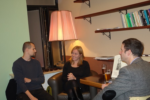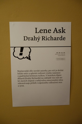 “Kjære Rikard” er ikke oversatt til tsjekkisk i sin helhet, men et stykke av den er oversatt og inkludert I Komiksfests årlige katalog. Det var først og fremst den boka som Ask kom for å presentere på Kaldi Fresh Coffee, en bokkafe like sør for Praha sentrum, i går kveld. I samband med en utstilling ble Ask intervjuet i et fullstappet (og riktignok ganske lite) lokale – Ikke bare om sin serieskaperkarriere, men også om tilknyttingen til Praha. I tillegg til å deltatt på festivalen før studerte hun også fotografi i Praha, der hun ble kjent med kontinentale alternativ til de mer vanlige amerikanske fotograferingsteknikkene.