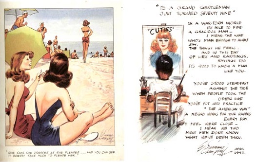 E. Simms Campbell med «pene damer» enruteren «Cuties» var ein av dei få syndikerte afro-amerikanske serieskaparane. Dette var kontroversielt på 1940-talet, men Hearst lot seg ikkje presse s. 203
