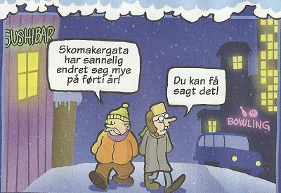Det beste av disse tre heftene. Ikke alt er like morsomt, men Rutetid scorer høyt på både variasjon og julestemning. «La oss uironisk omfavne den nostalgiske gode julestemningen» annonseres det i forordet. Sagt med litt…vel, ironi selvsagt, men heftet har en fin balanse mellom kynisme og kos. Marius Henriksen og Anders Pedersen bidrar med observasjoner om julefrustrasjoner som alle kan kjenne seg igjen i. Tor Ærlig morer seg med å visualisere barns tolkninger av kjente og kjære julesanger. På den hjertevarme siden har Flis laget et juledikt, og Arne Killingberg har, i tillegg til å diske opp med en håndfulle jule-enrutere, også laget en historie der han forestiller seg hvordan Skomakergata ser ut i dag. Den er nesten like trivelig som originalen. Bare litt synd at Øverli selv ikke kunne by på flere julerelaterte Rutetid-gags i år. Faktisk så har Nils Axle Kanten flere julevitser, bare i dette heftet.