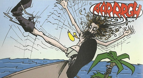 Skinny T hadde, så vidt jeg vet, sin debut i Gorilla #1 (Egmont, 2003) handler rett og slett om at figuren Skinny T jages av en kåt badeand. Når Skinny T i tillegg ergrer på seg den helsprø naboen sin, begynner den narrative ballen å rulle, og Skinny jages land og strand rundt av både badeanden og naboen. Jeg hørte Alexander Leborg en gang si at dette var ”antageligvis verdens tynneste plot” Noe som viser seg å ikke være et problem.
