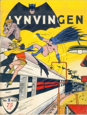 Så vender vi tilbake til 1953 og gode, gamle Lynvingen, som Batman ble døpt på norsk. Også denne kom i kartongomslag, og også disse heftene (fra SE-bladene) er svært ettertraktet for samlere. Lynvingen #1 har samme fargetrykk som Stålmannen; rødt og svart. Det fungerer faktisk overraskende bra, her er altså alle farger i heftet fjernet (bortsett fra den sorte streken) og den norske fargesetteren har lagt inn karmosinrødt (datidens standard ukebladkulør) på utvalgte steder for å «styrke» bilderuten. Historien presenterer «Two-Face» på norsk som «Dobbeltansiktet». Heftet rundes av med småplukk samt en flott fortelling med Vigilante (westernkarakteren som raser rundt på en futuristisk MC).