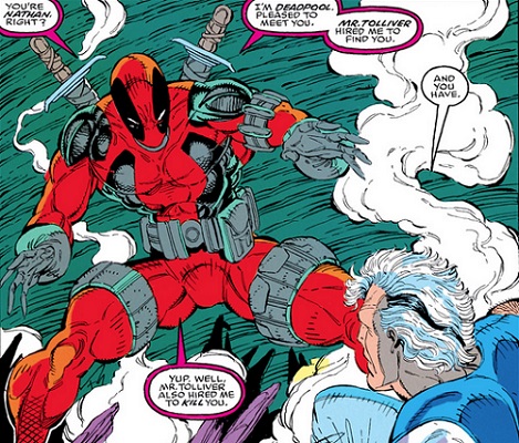 Heller er det ikke Slade Wilson, alias Deathstroke, selv om mange også har påpekt den likheten. Selv hevder Rob Liefeld at det var Spider-Man, heller enn Slade, han hadde i tankene da han skapte Deadpool. Figuren opptrådde første gangen i New Mutants # 98 i 1991, på det tidspunktet da Liefeld var i ferd med å omgjøre New Mutants til X-Force. Han hadde noen opptredener i X-Force, der bajasoppførselen hans sto i tydelig kontrast til de mer alvorlige og selvhøytidelige heltene og antiheltene som var typisk for Liefeld. Men skikkelig fart i sakene ble det da han fikk sin egen miniserie og senere sitt eget månedsblad. Forfatterne Fabian Nicieza og Joe Kelly endret ham fra en skurkaktig leiemorder til en amoralsk antihelt som ofte brøt den såkalte fjerde veggen og snakke direkte til leserne. Siden da har Deadpool vært en av Marvels mest eksponerte (etterhvert overeksponerte) figurer, og hele Marveluniversets hoffnarr.
