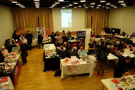 Det handler bare om i hvilken retning en velger å vokse. Jeg tenker meg ettersom denne har fokuset på de små kreatørene, på selvpubliseringen og fanzinene, er det på det området vi skal vokse. Så vi kommer med overlegg til å ekskludere forlag, og likeså firmaer som vil selge produkter. For det er ikke vårt fokus. Vårt fokus er at tegnerne skal få mer plass. Så om vi skal vokse, skal det være ved å tilby ting som f.eks. workshops. Vi har allerede begynt å snakke med Region Skåne, som finansierer større prosjekt over hele regionen. Vi ser for oss workshops om fanziner på en turne rundt om i Skåne, som avsluttes med Seriefest. Det eneste problemet er at vi har litt voksesmerter fordi det er så mange som vil være med. Vi trenger mer plass. Men biblioteket har antydet at vi kan utvide på andre steder i lokalet. Så langt har vi brukt opp hele plassen på Röda Rummet på Stadsbiblioteket, pluss foajeen. Over hundre serietegnere var representerte her i år.