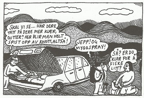 Kvammen utmerker seg som en interessant og ganske original forteller, både i tegning og manus, men av ulike grunner. Jeg skal begynne med det meste åpenbare, nemlig tegningene. Inspirasjonen fra Christopher Nielsen er blitt nevnt, blant annet av NRK, men Kvammens tegninger er mer naivistiske, inspirert av impresjonistisk kunst, kanskje til og med av ortodoks ikonkunst. Bruken av svarte streker er gjennomgående særs viktig i den grafiske framstillingen; nesten alt av skygger og bakgrunner og landskap er bygd opp på den måten. Det er veldig stilisert og flatt, men behagelig å se på og lese, og det tilføyer en egenartet skjønnhet særlig til landskapene. Og Kvammen elsker landskap; helsider med landskapsbilder og utsnitt går igjen i hele boka, og fungerer som kapittelinndelinger om du skulle trenge det. Men viktigst er det at de gjør boka mer «luftig», og derfor mer behagelig å lese.