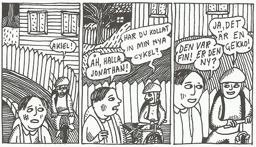 Når det gjelder historiefortelling kan være greit å se tilbake på Kvammens tegneserie om sin grandonkel Knut i Forresten nr. 29 (1915). Denne var rik på tekst og hadde en fortellerstemme. Og det var greit nok til sitt bruk, over et par sider, men jeg er glad for at forfatteren har brukt en helt annen framgangsmåte her. Her er ingen forteller, og minste mulig er forklart. I størst mulig grad lar Kvammen bildene fortelle, og flere scener er uten dialog. Når det er mye dialog, er det i scener der en kan forvente at det bare tilfeldigvis blir pratet mye, så det virker naturlig. Noe av dialogen er selvsagt oppklarende, men i konteksten er den også naturlig, og Kvammen har det ikke travelt med å forklare. Ganske mye blir vi forventet å forstå utfra illustrasjonene. Det er intelligent historiefortelling med respekt for leseren.