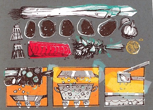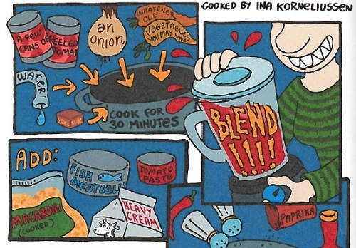 Den polske serieskaperen Izabela Dudzik bidrar med en laksesuppe til kokeboken. Dette er et utdrag fra oppskriften.