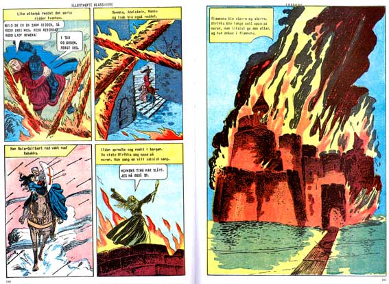 Og Ivanhoe (etter Walter Scotts roman) er nok den IK-historien som sitter best av disse 4. Kanskje fordi den er den nyeste historien, fra 1957? De andre, spesielt PRÆRIEN fra 1949 og GREVEN AV MONTE CRISTO fra 1942, er av mye svakere kvalitet. ROB ROY, det fjerde innslaget i denne boken, er “nest yngst”, fra 1955, og er bedre enn de to gamle historiene. Både Ivanhoe og Rob Roy tar vare på actionpregede sekvenser; kamp og konflikt, på en mye bedre måte enn de to andre, som er mer eller mindre fri for dramatisk handling. Spesielt Ivanhoe viser anslag av tegneseriedramatikk som sitter noenlunde, med lanseturneringen og borgbrannen som de to store høydepunktene. Cristo er et eksempel på det absolutt motsatte, der mange dramatiske handlinger blir referert til med tekst istedet for tegninger, for så å gå videre med side opp og side ned med “talking heads”.