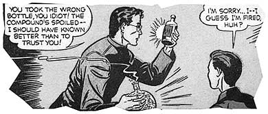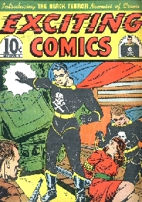 Jag börjar med en ganska okänd superhjälte, Black Terror och hans origin. Black Terror var med nyligen i Galactus nummer fem och sex, så det känns naturligt att börja med honom. En tönt uppfinner nåt slags vätska som kallas för eter. Halvbra idé, den får godkänt av mej faktiskt, tre dödskallar av fem. Att dräkten är en maskeradkostym är också kul.