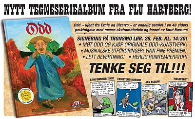 Lørdag er Flu Hartberg på ny albumaktuell. Denne gangen lanserer han tegneseriealbumet Odd på Tronsmo.