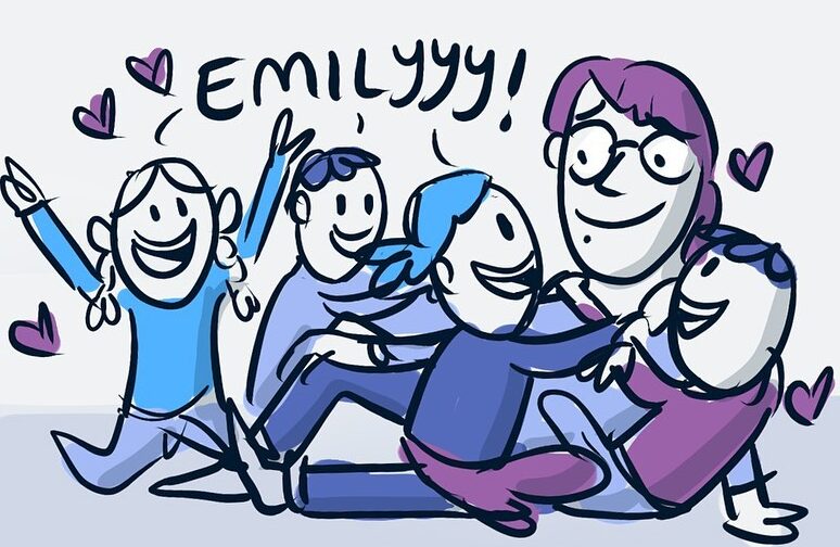 Emily gikk tegneserielinja på Bjerkely folkehøyskole i 2013-2014 (og var deretter stipendiat året etterpå), hvor hun har møtt de fleste tegneserievennene i sin omgangskrets. Hun bor med Hege M. Haugan (alias «Kvasimenneske»), som hjelper henne mye med dialogene. Hun pitcher også mye fram og tilbake med Ingvild Th. Kristiansen, og andre venner hun trekker fram er Tuva og Viktoria Røisli og Ingeborg Wiulsrød. -Jeg syns det er viktig å ha venner man kan idémyldre med, og det får ofte i gang den kreative flyten, forteller hun. -Det hjelper en hel masse hvis jeg sitter fast!