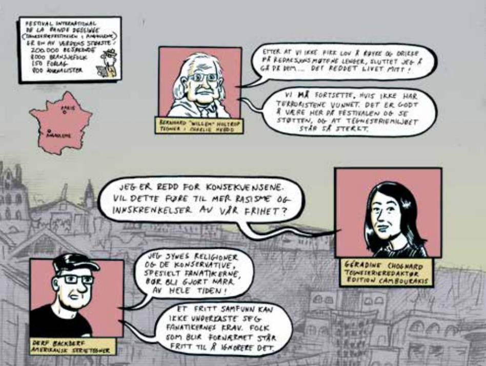 Tegneseriereportasje (utsnitt) fra Angoulême (2015)., laget av Flu Hartberg og Erle Marie Sørheim for Dagbladet, rett etter attentatet mot Charlie Hebdo