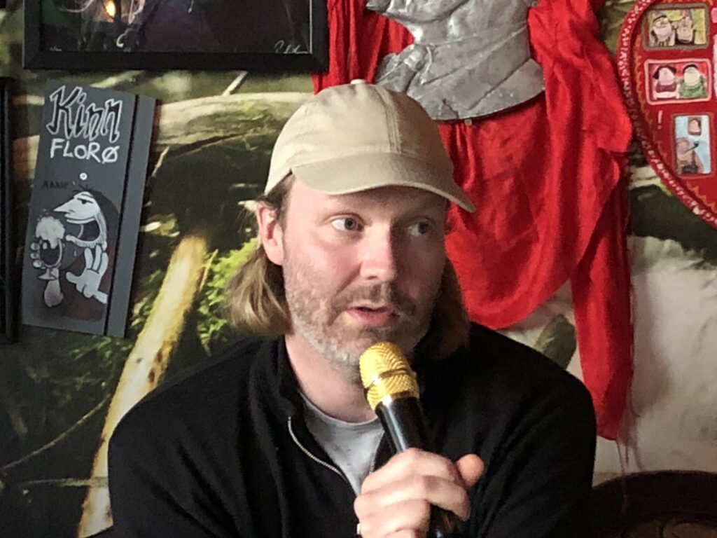 Anders på BarBarista i samband med en presentasjon nylig. For å skape en slags distanse, er hans alter ego i tegneseriene mørkhåret.