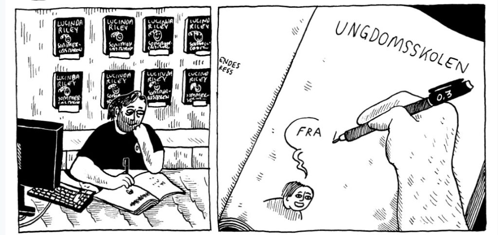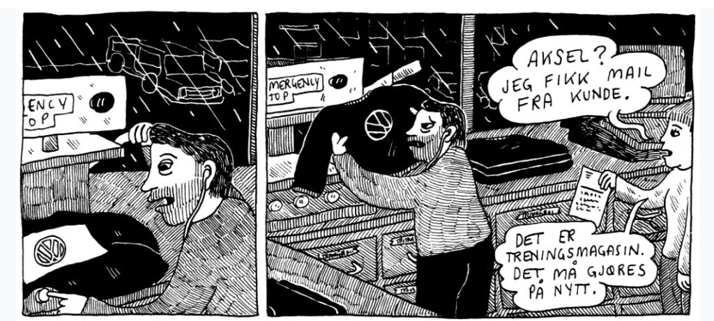 Faktisk så jobba jeg der nesten et år. Men jeg gikk veldig mange runder med både meg selv, moren min, og redaktørene mine, som mente at det ville være ugreit å gjøre for mye ut av det. For min del var det vonde med miljøarbeiderjobben at jeg synes ikke hen – jeg sier hen – ble behandlet noe særlig bra av systemet. I den lille sekvensen forsøkte jeg å beskrive meg selv som den passive personen jeg var. Hvis jeg skulle laget et større kapittel, hadde jeg lagt vekt på å kritisere bruken av ufaglært hjelp. Jeg trengte bare en politiattest, og fra dag én skulle jeg dusje og vaske et voksent menneske, et veldig sårbart et. Jeg hadde ikke nok kunnskap til det. Så det ble bare en liten passasje, med svart humor, men jeg valgte å ikke vise personen, men heller på en måte prøve å allmenngjøre det lite grann, forhåpentligvis. Så folk som har hatt lignende jobber kanskje kan kjenne seg litt igjen. Og jeg gjorde karakteren min litt patetisk, han orker ikke helt å ta fatt i problemene. Men når det endelig var et punkt han kunne skinne på, så trådde han til for så vidt, da.