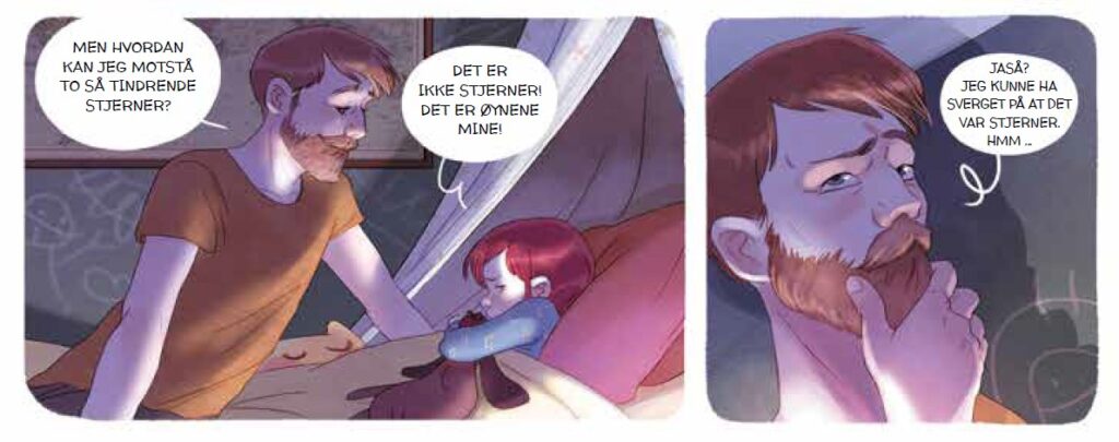 Og for å begynne med det generelle så kan en i alle fall slå fast at Gyldendal har gjort to ting mye bedre enn Fontini med serien (tre, hvis du teller med det at de har oversatt nesten alle bindene). For det første trykker de den i albumformat, så tegninger, farger og former kommer til sin rett. Jeg tenker da særlig på fargene og formene, for selve streken er ikke så veldig detaljorientert eller karakteristisk. Det er mer stemningen skapt av helheten en legger merke til, og som gir inntrykk av en idyllisk, lukket verden med litt sorg på bunnen.