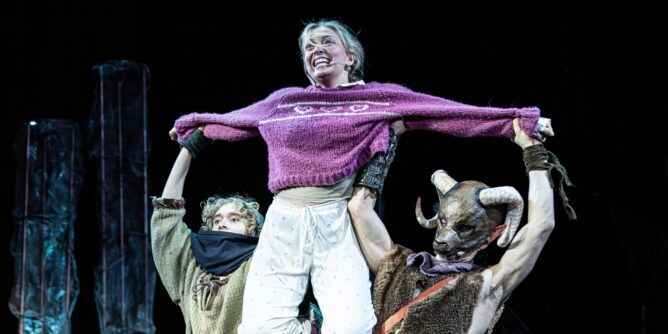 Trollet Trym er stort og skummelt og vi aldri ser han fysisk på scena, men vi opplever karakterane si frykt for han gjennom kroppsspråk og skumle lydar gjennom lydbiletet. Når vi møter Gnist, den vesle blå augestikkaren til Sonja, får vi høyre ein glad melodi. Skuggeteater blir også brukt for å fortelje starten på historia om Jotundalen, og det likte eg godt.