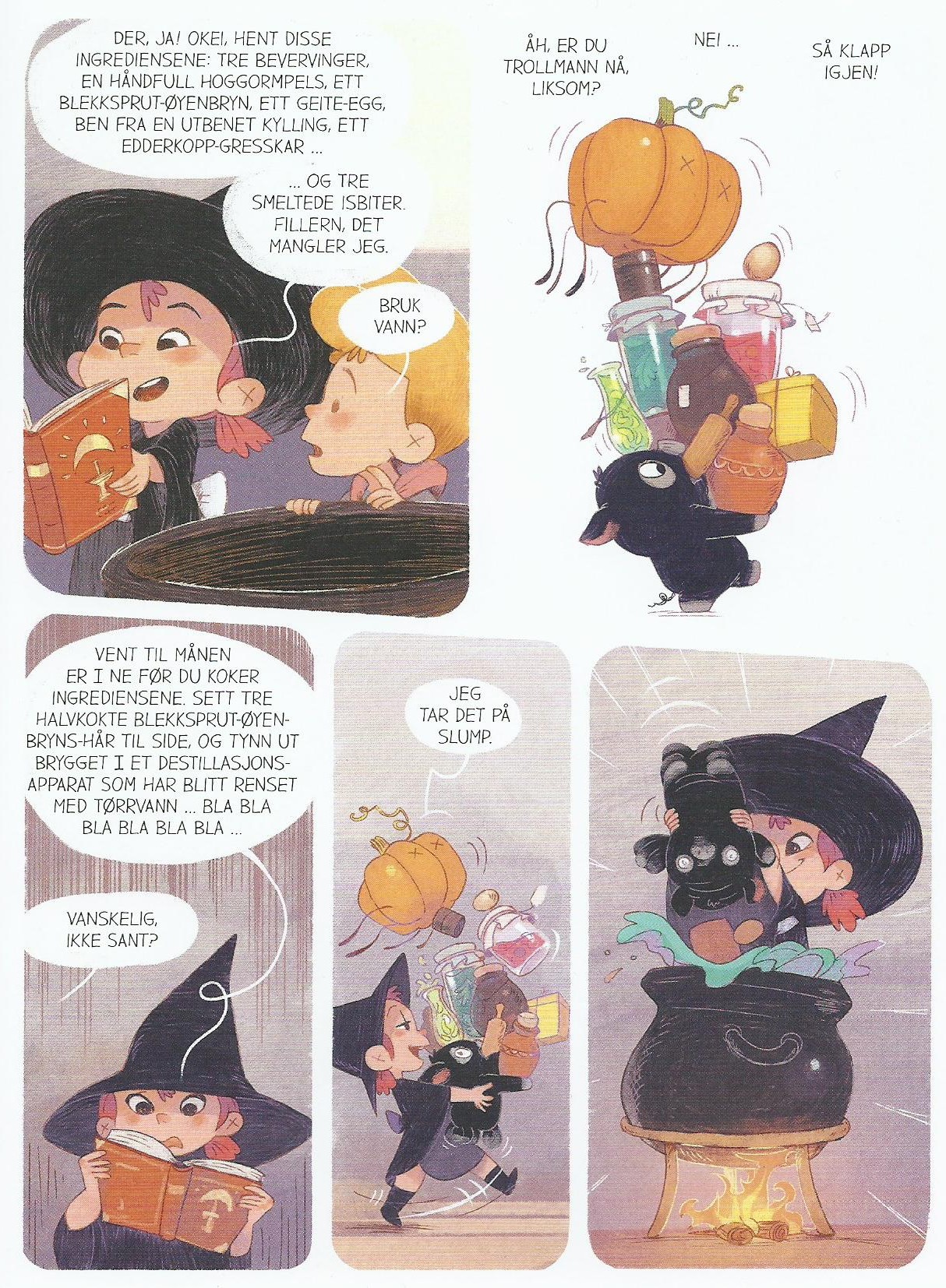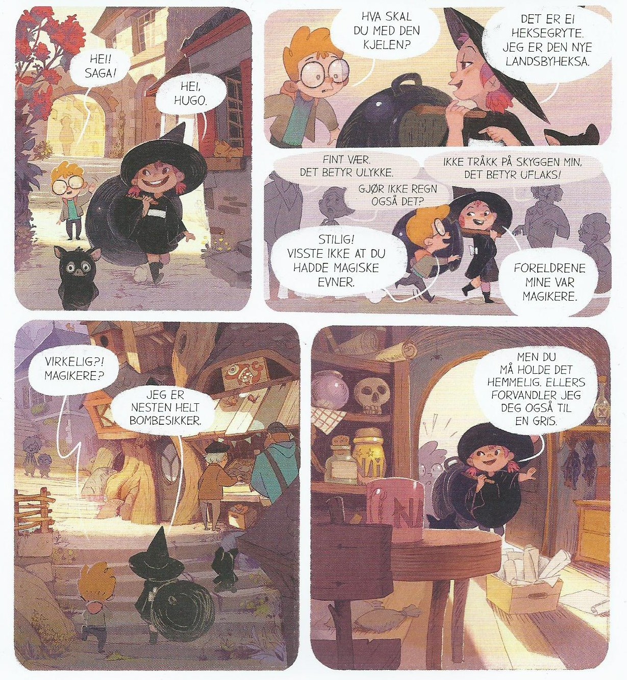 Åpningssitatet stammer fra Snorre, grisungen som seriens titulære hovedperson tar til sin heksehjelper (familiar). For de fleste i landsbyen ser det nok ut som Saga bare leker at hun er heks, med veldig stor overbevisning. Men hun må ha et dypere instinkt, for en dag kommer adoptivfaren hennes med en trolldomsbok som han fant på henne da hun var veldig liten. Ytterligere oppmuntret begynner hun å studere den, og åpner sin egne heksebutikk. Uten kunder, riktig nok. Man skulle nesten tro at lokalbefolkningen ikke tar en hyperaktiv åtteåring som sier at hun er en heks, på alvor. Saga har magiske krefter, viser det seg, men de er ikke ufeilbarlige, og når de fungerer, er det stort sett under ekstraordinære omstendigheter.